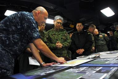 | Keywords: US Navy 110331-N-SB673-105 Rear Adm. Robert Girrier explains operations supporting earthquake and tsunami relief efforts to Lt. Gen. Eiji Kimizuka.jpg en PACIFIC OCEAN March 31 2011 Rear Adm Robert Girrier left commander of Carrier Strike Group CSG 7 explains operations supporting earthquake and tsunami relief efforts to Japan Self-Defense Forces Lt Gen Eiji Kimizuka commanding general of Joint Task Force Touhoku during a visit to the aircraft carrier USS Ronald Reagan CVN 76 Ronald Reagan is off the coast of Japan providing humanitarian assistance to Japan as directed in support of Operation Tomodachi U S Navy photo by Mass Communication Specialist 3rd Class Dylan McCord/Released 2011-03-31 110331-N-SB673-105 Navy http //www navy mil/view_image asp id 99343 U S Navy photo by Mass Communication Specialist 3rd Class Dylan McCord PD-USGov-Military-Navy USS Ronald Reagan CVN-76 humanitarian aid Operation Tomodachi in March 2011 Eiji Kimizuka Guests aboard USS Ronald Reagan CVN-76 |