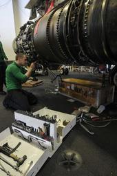| Keywords: US Navy 110426-N-1004S-053 Aviation Machinist's Mate Airman Brandon Barlow installs essential wiring to the engine of an EA-6B Prowler.jpg en PACIFIC OCEAN April 26 2011 Aviation Machinist's Mate Airman Brandon Barlow from Union Dale Penn assigned to the Tactical Electronic Warfare Squadron VAQ 139 installs essential wiring to the engine of an EA-6B Prowler in the hangar bay of the aircraft carrier USS Ronald Reagan CVN 76 Ronald Reagan is operating in the Pacific Ocean U S Navy photo by Mass Communication Specialist 3rd Class Shawn J Stewart/Released 2011-04-26 110426-N-1004S-053 Navy http //www navy mil/view_image asp id 100327 U S Navy photo by Mass Communication Specialist 3rd Class Shawn J Stewart PD-USGov-Military-Navy Aviation Machinist's Mate Maintenance of military aircraft on USS Ronald Reagan CVN-76 |