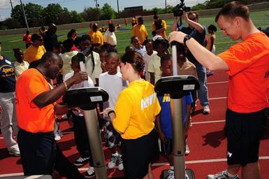 | Keywords: US Navy 110426-N-00332-103 Sailors measure the height and body weight of fourth and fifth grade students from Lindenwood Elementary School.jpg en NEWPORT NEWS Va April 26 2011 Logistics Specialist 1st Class Alhaji M Kabba left a command fitness leader aboard the aircraft carrier USS Theodore Roosevelt CVN 71 Sara S Pickett ship's nurse and Lt Cmdr Jared Tharp the command fitness leader measure the height and body weight of fourth and fifth grade students from Lindenwood Elementary School Sailors assigned to Theodore Roosevelt spent 10 weeks mentoring the students about the Navy's culture of fitness to prepare them for participation in the Navy Physical Fitness Assessment U S Navy photo by Mass Communication Specialist Seaman Cory C Asato/Released 2011-04-26 110426-N-00332-103 Navy http //www navy mil/view_image asp id 100339 U S Navy photo by Mass Communication Specialist Seaman Cory C Asato PD-USGov-Military-Navy Aboard USS Theodore Roosevelt CVN-71 |