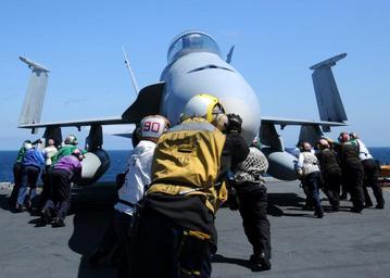 Keywords: US Navy 110511-N-5574R-389 Sailors maneuver an F-A-18A- Hornet aboard USS George H.W. Bush (CVN 77).jpg en ATLANTIC OCEAN May 11 2011 Sailors maneuver an F/A-18A+ Hornet assigned to the Golden Warriors of Strike Fighter Squadron VFA 87 aboard the aircraft carrier USS George H W Bush CVN 77 George H W Bush the Navy's newest aircraft carrier is deployed as a part of George H W Bush Carrier Strike Group in support of maritime security operations and theater security cooperation efforts in the U S 5th and 6th Fleet areas of responsibility U S Navy photo by Mass Communication Specialist 3rd Class Jeffrey M Richardson/Released 2011-05-11 110511-N-5574R-389 Navy http //www navy mil/view_image asp id 100902 U S Navy photo by Mass Communication Specialist 3rd Class Jeffrey M Richardson PD-USGov-Military-Navy Aboard USS George H W Bush CVN-77 Strike Fighter Squadron 87 United States Navy |