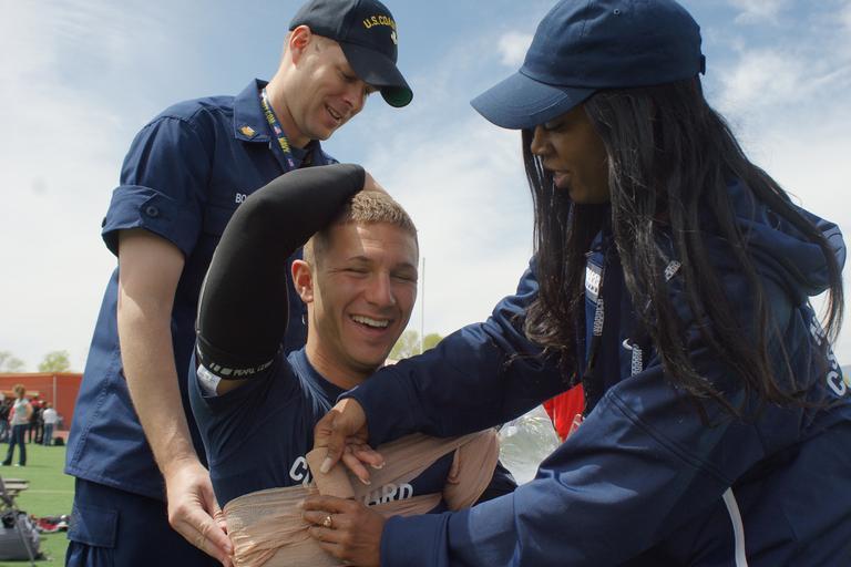 | Keywords: US Navy 110517-N-KE905-331 Hospital Corpsman 1st Class Rosalyn Martin, right, with the assistance of Coast Guardsman Health Services Technician 1st.jpg en COLORADO SPRINGS Colo May 17 2011 Hospital Corpsman 1st Class Rosalyn Martin right a general duty corpsman assigned to the Navy Bureau of Medicine and Surgery BUMED with the assistance of Coast Guardsman Health Services Technician 1st Class Jason M Bosko assigned to Health Service Work Life Service Center secures ice to the shoulder of retired Master-at-Arms 3rd Class Nathan DeWalt following DeWalt's two silver medal wheelchair cycling wins in the track and field competition of the 2011 Warrior Games at Garry Berry Stadium The Warrior Games is a Paralympic-style sport event among 200 seriously wounded ill and injured service members from the U S Army Navy Air Force Marine Corps and Coast Guard U S Navy photo by Zona T Lewis/Released 2011-05-17 110517-N-KE905-331 Navy http //www navy mil/view_image asp id 101185 U S Navy photo by Zona T Lewis PD-USGov-Military-Navy 2011 Warrior Games at Garry Berry Stadium Images from US Navy location COLORADO SPRINGS Colo Wheelchair racing Hospital Corpsman |