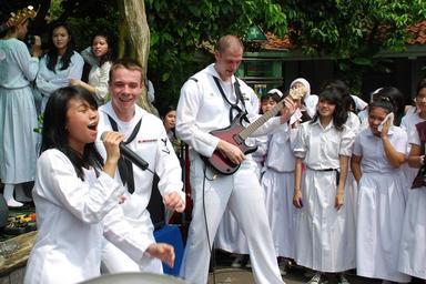 Keywords: US Navy 110527-N-VP123-771 Musician 3rd Class Gabriel Brown invites a student of SMAN-21 High School in Jakarta to help perform a song.jpg en JAKARTA Indonesia May 27 2011 Musician 3rd Class Gabriel Brown invites a student of SMAN-21 High School in Jakarta to help perform a song during a concert as part of Cooperation Afloat Readiness and Training CARAT Indonesia 2011 CARAT is a series of bilateral exercises held annually in Southeast Asia to strengthen relationships and enhance force readiness U S Navy photo by Lt Cmdr Mike Morley/Released 2011-05-27 110527-N-VP123-771 Navy http //www navy mil/view_image asp id 101793 U S Navy photo by Lt Cmdr Mike Morley PD-USGov-Military-Navy Images from US Navy location Jakarta Indonesia Cooperation Afloat Readiness and Training 2011 |