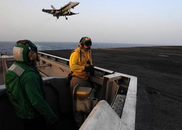 | Keywords: US Navy 110605-N-SB672-177 Aviation Boatswain's Mate (Equipment) 2nd Class Michael McClendon, left, and Lt. Brandon Decker man the arresting gear d.jpg en ARABIAN SEA June 5 2011 Aviation Boatswain's Mate Equipment 2nd Class Michael McClendon left from Detroit and Lt Brandon Decker from Anchorage Alaska man the arresting gear deck edge as an F/A-18C Hornet assigned to the Death Rattler of Marine Fighter Attack Squadron VMFA 323 lands aboard the aircraft carrier USS Ronald Reagan CVN 76 Ronald Reagan and Carrier Air Wing CVW 14 are deployed to the U S 5th Fleet area of responsibility conducting close-air support missions as part of Operation Enduring Freedom U S Navy photo by Mass Communication Specialist 3rd Class Dylan McCord/Released 2011-06-05 110605-N-SB672-177 Navy http //www navy mil/view_image asp id 102234 U S Navy photo by Mass Communication Specialist 3rd Class Dylan McCord PD-USGov-Military-Navy F/A-18 Hornet landings on USS Ronald Reagan CVN-76 |