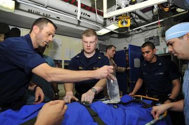 Keywords: US Navy 110606-N-ZZ999-002 Medical personnel aboard the aircraft carrier USS Enterprise (CVN 65) prepare to treat a medically evacuated sailor from.jpg en GULF OF ADEN June 6 2011 Medical personnel aboard the aircraft carrier USS Enterprise CVN 65 prepare to treat a medically evacuated sailor from the German-flagged motor vessel Baltic Island The sailor was initially transported from Baltic Island to the Republic of Korea navy destroyer ROKS Chungmugong Yi Sun-Shin DDH 975 before being moved to the Royal Fleet Auxiliary primary casualty receiving ship RFA Argus A135 After being evaluated aboard Argus he was transferred to Enterprise for advanced treatment U S Navy photo by Mass Communication Specialist 3rd Class Peter D Melkus/Released 2011-06-06 110606-N-ZZ999-002 Navy http //www navy mil/view_image asp id 102261 U S Navy photo by Mass Communication Specialist 3rd Class Peter D Melkus PD-USGov-Military-Navy Aboard USS Enterprise CVN-65