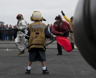| Keywords: US Navy 110613-N-DR144-100 A sponsored tiger cruise participant waves a flag signifying a class bravo fire as flight deck personnel demonstrate air.jpg en PACIFIC OCEAN June 13 2011 A sponsored tiger cruise participant waves a flag signifying a class bravo fire as flight deck personnel demonstrate aircraft firefighting drills to friends and family aboard the Nimitz-class aircraft carrier USS Carl Vinson CVN 70 during the ship's tiger cruise Carl Vinson and Carrier Air Wing CVW 17 recently completed a deployment the U S 5th and 7th Fleet areas of responsibility U S Navy photo by Mass Communication Specialist 2nd Class James R Evans/Released 2011-06-13 110613-N-DR144-100 Navy http //www navy mil/view_image asp id 102534 U S Navy photo by Mass Communication Specialist 2nd Class James R Evans PD-USGov-Military-Navy Aboard USS Carl Vinson CVN-70 People with flags |
