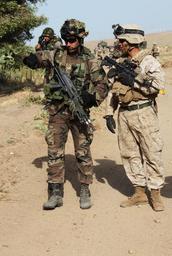 Keywords: US Navy 110625-M-EK802-058 U.S. and Spanish marines conduct improvised explosive device training.jpg en SIERRA DEL RETIN Spain June 23 2011 Frank Rodriguez left a Spanish marine assigned to Spain's Third Mechanized Landing Battalion points out an improvised explosive device indicator to U S Marine Lance Cpl Jhosue M Escate a squad automatic weapon gunner assigned to Light Armored Reconnaissance Platoon Weapons Company Battalion Landing Team 2nd Battalion 2nd Marine Regiment 22nd Marine Expeditionary Unit during counter improvised explosive device training The training is part of the Spanish Amphibious Bilateral Exercise a 10-day exercise intended to increase interoperability between U S and Spanish marines U S Marine Corps photo by Cpl Dwight Henderson/Released 2011-06-23 110625-M-EK802-058 Navy http //www navy mil/view_image asp id 103488 U S Marine Corps photo by Cpl Dwight Henderson PD-USGov-Military-Navy Images from US Navy location SIERRA DEL RETIN Spain 22nd Marine Expeditionary Unit Spanish Navy Marines June 2011 in Spain M4 carbine with blank-firing adaptor |