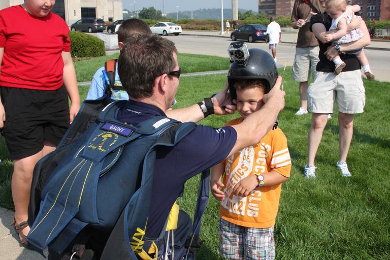 | Keywords: US Navy 110903-N-NT881-105 Chief Special Warfare Operator (SEAL) Justin Gauny, assigned to the U.S. Navy parachute demonstration team, the Leap Fro.jpg en CINCINNATI Sept 3 2011 Chief Special Warfare Operator SEAL Justin Gauny assigned to the U S Navy parachute demonstration team the Leap Frogs helps a boy try on his helmet at the Cincinnati Museum Center during a Cincinnati Navy Week event Cincinnati Navy Week is one of 21 Navy weeks planned across America this year Navy weeks are intended to show Americans the investment they have made in their Navy and increase awareness in cities that do not have a significant Navy presence U S Navy photo by Chief Mass Communication Specialist Steve Carlson/Released 2011-09-03 110903-N-NT881-105 Navy http //www navy mil/view_image asp id 106838 U S Navy photo by Chief Mass Communication Specialist Steve Carlson PD-USGov-Military-Navy Cincinnati Museum Center at Union Terminal United States Navy Parachute Team Parachuting equipment Head cameras Cincinnati Navy Week Military people of the United States with children |