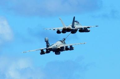Keywords: US Navy 110904-N-UO379-081 An EA-6B Prowler and an F-A-18F Super Hornet demonstrate a mid-air refueling evolution as they fly near USS Ronald Reaga.jpg en PACIFIC OCEAN Sept 4 2011 An EA-6B Prowler assigned to the Cougars of Tactical Electronic Warfare Squadron VAQ 139 and an F/A-18F Super Hornet assigned to the Black Knights of Strike Fighter Squadron VFA 154 demonstrate a mid-air refueling evolution as they fly near the aircraft carrier USS Ronald Reagan CVN 76 during a tiger cruise Ronald Reagan is returning from a seven-month deployment U S Navy photo by Mass Communication Specialist 3rd Class Alexander Tidd/Released 2011-09-04 110904-N-UO379-081 Navy http //www navy mil/view_image asp id 106853 U S Navy photo by Mass Communication Specialist 3rd Class Alexander Tidd PD-USGov-Military-Navy Aboard USS Ronald Reagan CVN-76 Grumman EA-6 Prowler in flight Aerial refueling by F/A-18F Super Hornet Strike Fighter Squadron 154 United States Navy Electronic Attack Squadron 139 United States Navy |