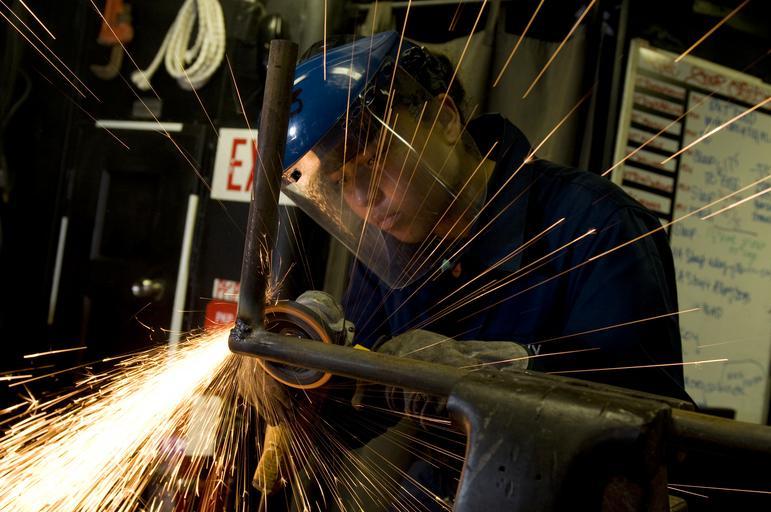 Keywords: US Navy 110924-N-TZ605-148 Hull Technician Fireman Jessica Crosby, assigned to Engineering Department's R-1 Division, makes a hand rail aboard the.jpg en PACIFIC OCEAN Sept 24 2011 Hull Technician Fireman Jessica Crosby assigned to Engineering Department's R-1 Division makes a hand rail aboard the Nimitz-class aircraft carrier USS Carl Vinson CVN 70 Carl Vinson and Carrier Air Wing 17 are underway conducting operations off the coast of Southern California U S Navy photo by Mass Communication Specialist 3rd Class Timothy A Hazel/Released 2011-09-24 110924-N-TZ605-148 Navy http //www navy mil/view_image asp id 107791 U S Navy photo by Mass Communication Specialist 3rd Class Timothy A Hazel PD-USGov-Military-Navy Aboard USS Carl Vinson CVN-70 Angle grinders without protective jacket Face shields Chemical sparks |