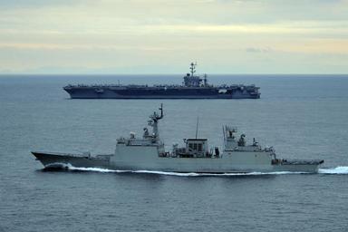 | Keywords: US Navy 110929-N-DS193-001 The Republic of Korea destroyer Wang Geon (DDH 978), front, escorts the aircraft carrier USS George Washington (CVN 73).jpg en KOREA STRAIT Sept 29 2011 The Republic of Korea destroyer Wang Geon DDH 978 front escorts the aircraft carrier USS George Washington CVN 73 through the Korea Strait George Washington is conducting a 2011 patrol U S Navy photo by Mass Communication Specialist 2nd Class Adam K Thomas/Released 2011-09-29 110929-N-DS193-001 Navy http //www navy mil/view_image asp id 108075 U S Navy photo by Mass Communication Specialist 2nd Class Adam K Thomas PD-USGov-Military-Navy Aboard USS George Washington CVN-73 ROKS Wang Geon DDH 978 |