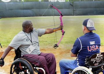 Keywords: US Navy 111005-N-KA543-027 Retired Coast Guard Lt. Sancho Johnson, left, uses his mouth to draw back his arrow.jpg en SAN DIEGO Oct 5 2011 Retired Coast Guard Lt Sancho Johnson left uses his mouth to draw back his arrow as Paralympics military coach Jeff Fabry gives direction during the archery portion of the Paralympics Military Sports Camp at Naval Medical Center San Diego Fifty-two wounded ill or injured service men and women including Afghanistan and Iraq war veterans are participating in the camp from Oct 3 to 5 The three-day event introduces Paralympics sports such as archery basketball biathlon cycling rowing sitting volleyball strength and conditioning swimming and track and field to service members The U S Olympic Committee sponsors the camp U S Navy photo by Mass Communication Specialist 2nd Class Chad A Bascom/Released 2011-10-05 111005-N-KA543-027 Navy http //www navy mil/view_image asp id 108413 U S Navy photo by Mass Communication Specialist 2nd Class Chad A Bascom PD-USGov-Military-Navy Naval Medical Center San Diego People in wheelchairs Archery |