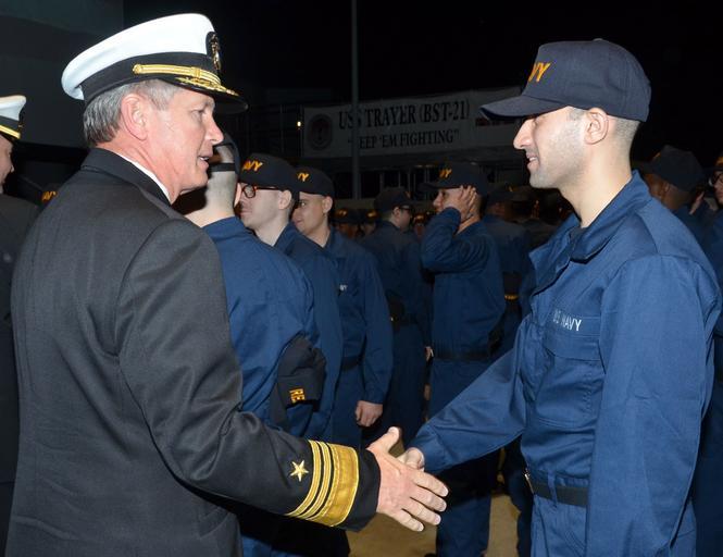 Keywords: US Navy 120127-N-FO977-812 Vice Adm. Gerald R. Beaman, commander of U. S. 3rd Fleet, congratulates a recruit following a capping ceremony at Recrui.jpg en GREAT LAKES Ill Jan 27 2012 Vice Adm Gerald R Beaman commander of U S 3rd Fleet congratulates a recruit following a capping ceremony at Recruit Training Command RTC Beaman toured the command's training facilities spoke with staff members and recruits and was the reviewing officer at the weekly pass in review graduation More than 525 recruits officially became Sailors at the weekly graduation U S Navy photo by Mike Miller/Released 2012-01-27 120127-N-FO977-812 Navy http //www navy mil/view_image asp id 114683 U S Navy photo by Mike Miller PD-USGov-Military-Navy Naval Station Great Lakes Gerald R Beaman Handshakes involving the military |