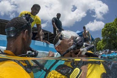 | Keywords: US Navy divers and Belizean coast guard divers practice SCUBA emergency procedures in a pool 140625-N-IP743-096.jpg en A Belize coast guard divers practice performing emergency procedures with U S Navy divers assigned to Mobile Diving and Salvage Unit Two MDSU 2 Company 2-1 The Belizean divers are working together with their American counterparts from MDSU 2 as part of Southern Partnership Station 2014 Southern Partnership Station 2014 is a U S Navy deployment focused on subject matter expert exchanges with partner nation militaries and security forces in Central and South America and the Caribbean U S military teams work with partner nation forces during naval-focused training exercises military-to-military engagements and community relations projects in an effort to enhance partnerships with regional maritime activities and improve the operational readiness of participants U S Navy photo by Mass Communication Specialist 1st Class Brett Cote/Released 2014-06-25 Petty Officer 1st Class Brett Cote https //www dvidshub net/image/1422541 140625-N-IP743-096 2014-06-27 00 02 BELIZE CITY BZ 3 PD-USGov-Military-Navy United States Navy Mobile Diving and Salvage Unit Two Southern Partnership Station 2014 Images from DoD uploaded by Fæ |