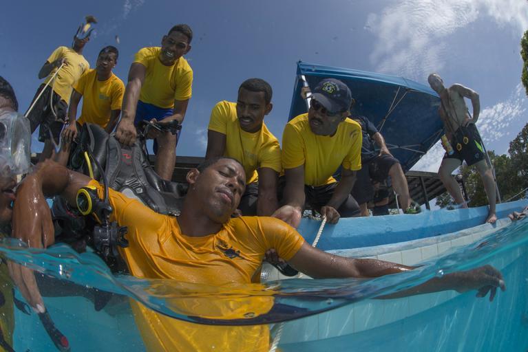 | Keywords: US Navy divers and Belizean Coast Guard divers practice SCUBA emergency procedures in a pool 140624-N-IP743-358.jpg en Belize Coast Guard divers practice emergency procedures during a Southern Partnership Station 2014 training dive The Belizean divers are working together with their American counterparts from Mobile Diving and Salvage Unit TWO as part of Southern Partnership Station 2014 Southern Partnership Station 2014 is a U S Navy deployment focused on subject matter expert exchanges with partner nation militaries and security forces in Central and South America and the Caribbean U S military teams work with partner nation forces during naval-focused training exercises military-to-military engagements and community relations projects in an effort to enhance partnerships with regional maritime activities and improve the operational readiness of participants U S Navy photo by Mass Communication Specialist 1st Class Brett Cote/Released 2014-06-24 Petty Officer 1st Class Brett Cote https //www dvidshub net/image/1420096 140624-N-IP743-358 2014-06-25 21 22 BELIZE CITY BZ 3 PD-USGov-Military-Navy United States Navy Mobile Diving and Salvage Unit Two Southern Partnership Station 2014 Images from DoD uploaded by Fæ |