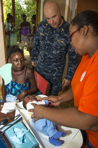 | Keywords: US Navy medical professionals work with Belizean medical professionals during Southern Partnership Station '14 140701-N-IP743-121.jpg en Lt Cmdr Tim Whiting a public health nurse assigned to Naval Medical Center Portsmouth observes as Rural Health Nurse Susan Rivero weighs a baby during a mobile clinic stop in a rural Belizean village Whiting is in Belize working with his counterparts as part of Southern Partnership Station 2014 Southern Partnership Station 2014 is a U S Navy deployment focused on subject matter expert exchanges with partner nation militaries and security forces in Central and South America and the Caribbean U S military teams work with partner nation forces during naval-focused training exercises military-to-military engagements and community relations projects in an effort to enhance partnerships with regional maritime activities and improve the operational readiness of participants U S Navy photo by Mass Communication Specialist 1st Class Brett Cote/Released 2014-07-01 Petty Officer 1st Class Brett Cote https //www dvidshub net/image/1432614 140701-N-IP743-121 2014-07-02 19 36 GALES POINT BZ PD-USGov-Military-Navy Southern Partnership Station 2014 Images from DoD uploaded by Fæ |