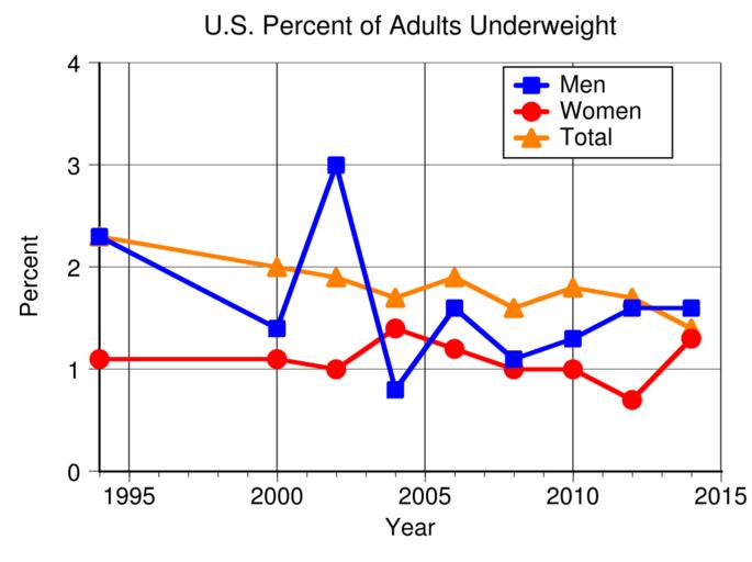 Keywords: US percent of adults underweight.svg en Percent of adults underweight in the United States Underweight is defined as a Body Mass Index BMI of less than 18 5 kg/m 2 Pregnant females were excluded Data from http //www cdc gov/nchs/data/hestat/underweight_adult_13_14/underweight_adult_13_14 htm CDC 2016-09-24 own Delphi234 other versions Generated with Wikimedia SVG Chart SVG Chart/box cc-zero Body mass index |