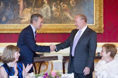 | Keywords: US, UK Joint Chiefs of Staff talk collaboration 140610-D-KC128-734.jpg en Chairman of the Joint Chiefs of Staff U S Army Gen Martin E Dempsey standing right shakes hands with Chief of the Defense Staff British army Gen Sir Nicholas Houghton after giving a gift during a dinner in honor of the U S Joint Chiefs of Staff concluding a defense chiefs strategic dialogue with the U S Joint Chiefs of Staff and their British counterparts June 10 2014 in London DoD photo by Mass Communication Specialist 1st Class Daniel Hinton U S Navy/Released 2014-06-10 Petty Officer 1st Class Daniel Hinton https //www dvidshub net/image/1399237 140610-D-KC128-734 2014-06-14 18 01 LONDON GTL GB PD-USGov Nicholas Houghton Martin E Dempsey in 2014 Images from DoD uploaded by Fæ |