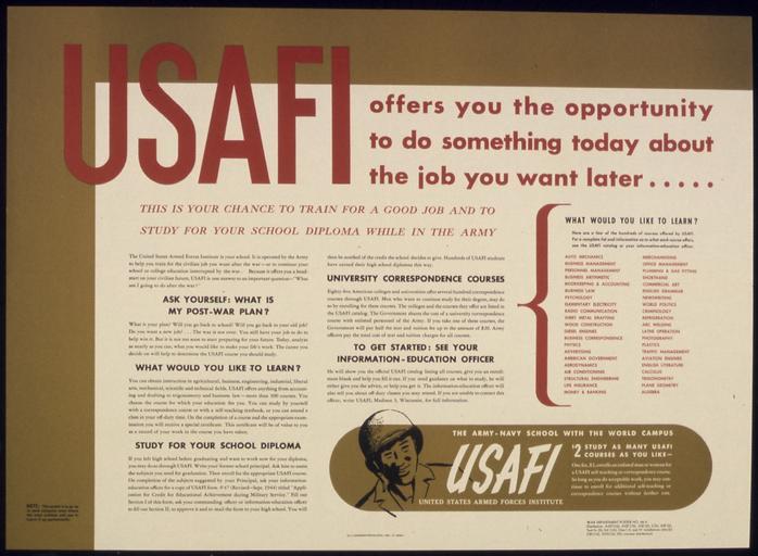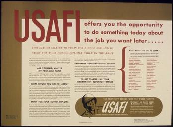 | Keywords: USAFI OFFERS YOU THE OPPORTUNITY TO DO SOMETHING TODAY ABOUT THE JOB YOU WANT LATER... - NARA - 515893.jpg Scope and content General notes 515893 Local identifier 44-PA-2184 Office for Emergency Management Office of War Information Domestic Operations Branch Bureau of Special Services 03/09/1943 - 09/15/1945 Still Picture Records Section Special Media Archives Services Division NWCS-S National Archives at College Park 8601 Adelphi Road College Park MD 20740-6001 1941 - 1945 Record group Record Group 44 Records of the Office of Government Reports 1932 - 1947 Record group ARC 373 World War II Posters compiled 1942 - 1945 Series ARC 513498 File unit File unit ARC Variant control numbers NAIL Control Number NWDNS-44-PA-2184 Other versions <gallery> File USAFI_OFFERS_YOU_THE_OPPORTUNITY_TO_DO_SOMETHING_TODAY_ABOUT_THE_JOB_YOU_WANT_LATER _-_NARA_-_515893 tif tif File USAFI_OFFERS_YOU_THE_OPPORTUNITY_TO_DO_SOMETHING_TODAY_ABOUT_THE_JOB_YOU_WANT_LATER _-_NARA_-_515893 jpg jpg </gallery> NARA-cooperation PD-USGov World War II posters from the United States |