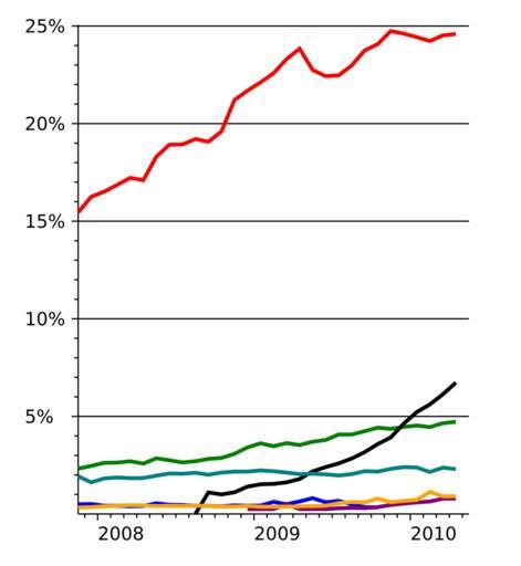 Keywords: Usage share of alternative web browsers.svg Usage share of alternative web browsers Source StatCounter svg Newer data middle of 2008 October 2011 Legend red Firefox black Chrome green Safari teal Opera blue Netscape purple Opera Mini Orange Other validSVG Usage share of alternative web browsers all browsers except MS IE Schema che mostra l'uso dei browser alternativi tutti i browser tranne MS IE Marktanteile alternativer Webbrowser alle Browser außer MS IE Alternatif web tarayıcılarının kullanım oranları MS IE hariç أغلب المستخدمين يفضلون برنامج موزيلا فاير فوكس الأكثر شعبية Procentowy udział alternatywnych przeglądarek na świecie Reparto del uso de navegadores web alternativos todos los navegadores excepto MS IE Использование альте нативных б аузе ов всех к оме IE 使用 主流網頁 覽器的佔 率(除了 MS IE 以外的 覽器) 使用 主流网页浏览器的占 率(除了 MS IE 以外的 浏览器) self-made http //marketshare hitslink com/browser-market-share aspx qprid 1 qptimeframe M qpsp 99 qpnp 18 November 2007 - April 2009 http //marketshare hitslink com/browser-market-share aspx qprid 1 qptimeframe M qpsp 124 qpnp 18 May 2009 - Present 2010-09-01 ARC Gritt thumb left 350px Historical browser market share October 2005 to May 2009 Line charts of web browser statistics |