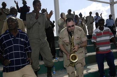 Keywords: USCENTAF Band kicks off Southwest Asia tour in Djibouti DVIDS73839.jpg en Senior Airman David Fatek U S Central Command Air Forces Band member performs for the Djibuti national police academy on Jan 22 2008 The USCENTAF band Live Round will be performing eight shows in 5 days in Africa for the base and the local community U S Air Force Photo/Staff Sgt Christina M Styer 2008-01-22 https //www dvidshub net/image/73839 73839 2008-01-22 12 26 CAMP LEMONNIER DJ PD-USGov Camp Lemonnier Images from DoD uploaded by Fæ |