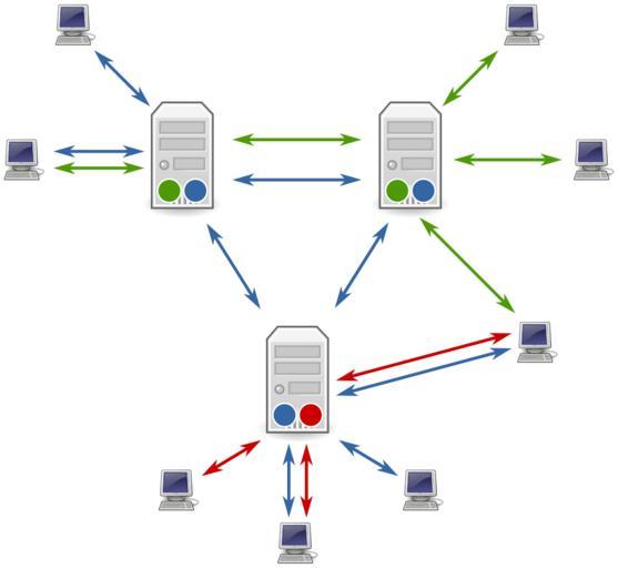 | Keywords: Usenet servers and clients.svg  A diagram of some Usenet servers and clients The blue green and red dots on the servers represent which groups they carry Arrows between servers indicate that the servers are sharing the articles from the groups Arrows between computers and servers indicate that the user is subscribed to a certain group and uploads and downloads articles to and from that server Created by bdesham in Inkscape This image includes Computer svg and Network-server svg public-domain icons from the Tango Desktop Project Images incorporating Tango icons Network topology Usenet |