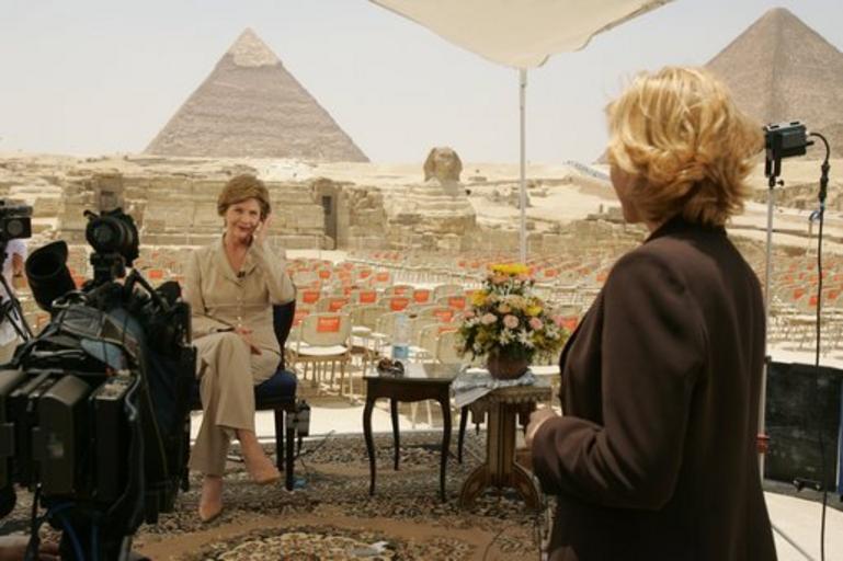 | Keywords: Usfirstladyinegypt.jpg Press Secretary Susan Whitson talks with Laura Bush between television interviews in front of the Giza Pyramids in Giza Egypt Monday May 23 2005 White House photo by Krisanne Johnson PD-USGov Laura Bush Photographs by Krisanne Johnson Visitors of the Giza pyramid complex 2005 2005 in Egypt |