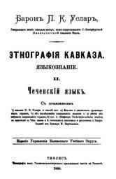| Keywords: Uslar-Chechen grammar cover.jpg en Cover of Peter Uslar's Chechen Grammar 1892 ru Обложка книги П К Усла а Чеченский язык 1892 Усла П К Этног афия Кавказа Языкознание II Чеченский язык Тифлис 1888 Author 1888 PD-old Petr Karlovich Uslar Title pages from Russia Books from Russia 1888 Linguistics books Printed books Chechen language Books published in Tbilisi |