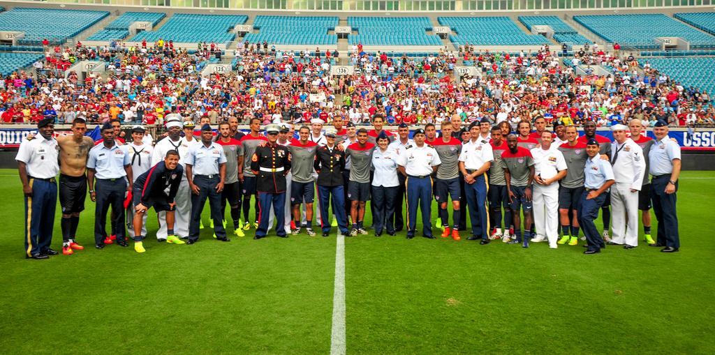 Keywords: USMNT posing with servicemembers 2014 Jacksonville.jpg en 140606-N-MJ645-332 JACKSONVILLE Fla June 6 2014 Servicemembers respresenting each branch of service gather for a group photograph with the U S Men's National Soccer Team at Everbank Stadium As a token of support and appreciation each branch of service gave dogtags to the soccer team as the team gets set to leave for Brazil this summer for 2014 World Cup play U S Navy photo by Mass Communication Specialist 2nd Class Marcus L Stanley/Released 2014-06-06 19 26 20 http //www defense gov/photoessays/PhotoEssaySS aspx ID 5220 U S Navy photo by Mass Communication Specialist 2nd Class Marcus L Stanley other versions Custom license marker 2015 07 28 PD-USGov-Mil-Navy Uploaded with UploadWizard Players of the United States men's national association football team 2014 in United States men's national soccer team EverBank Field Supporters of United States men's national association football team June 2014 in Florida Photographs taken on 2014-06-06 |