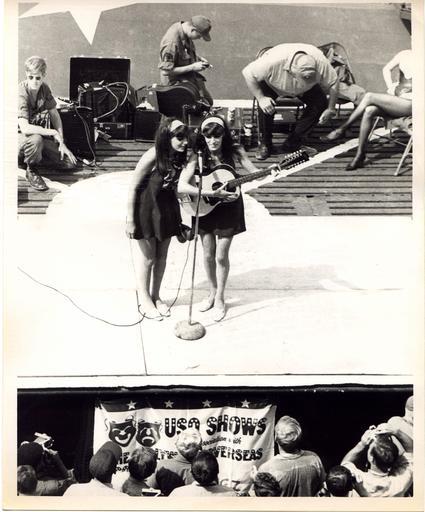 Keywords: USO Show Vietnam 1968 - Jennie & Terrie Frankel Sing to Troops - Best resolution Heli pad.jpg en This 1968 photo of Terrie and Jennie Frankel singing and playing guitar during a USO Tour to Vietnam was taken on a Heli pad on a ship This image is best resolution 1 MB 1968 own TwinsofSedona other versions South Vietnam cc-zero Uploaded with UploadWizard United Service Organizations Jennie Frankel Terrie Frankel Vietnam War 1968 Doublemint Twins Gibson 12 String Guitar Twin sisters Identical twins Soldiers Folk Songs |