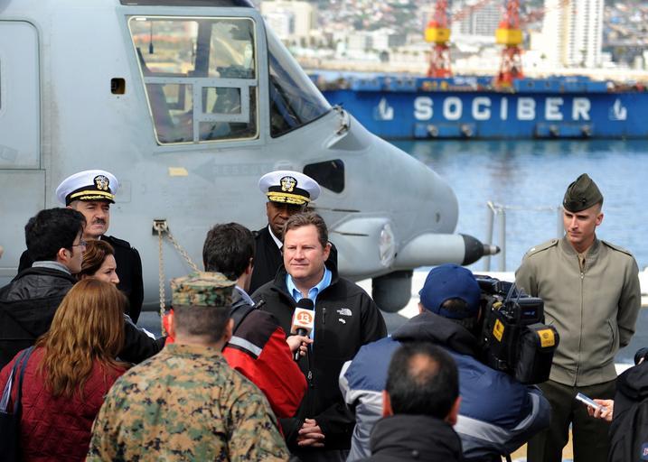 | Keywords: USS America tour 140824-N-CC789-042.jpg en Michael Hammer U S ambassador to Chile addresses the media during a press conference on the flight deck of future amphibious assault ship USS America LHA 6 shortly after the ship moored in Valparaiso Chile for a scheduled port visit America is currently traveling through the U S Southern Command and U S 4th Fleet area of responsibility on her maiden transit America visits the Americas America is the first ship of its class replacing the Tarawa-class of amphibious assault ships As the next generation big-deck amphibious assault ship America is optimized for aviation capable of supporting current and future aircraft such as the MV-22 Osprey and F-35B Joint Strike Fighter The ship is scheduled to be ceremoniously commissioned Oct 11 in San Francisco U S Navy photo by Mass Communication Specialist 1st Class Vladimir Ramos/Released 2014-08-24 Canadian Forces PO 1 VLADIMIR RAMOS https //www dvidshub net/image/1522064 140824-N-CC789-042 2014-08-26 02 19 VALPARAISO CL PD-USGov-Military-Navy MV-22B Osprey USS America LHA-6 Images from DoD uploaded by Fæ |