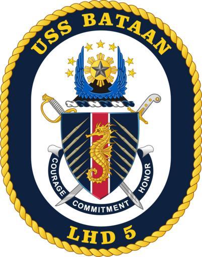 Keywords: USS Bataan COA.png en Emblem of the USS Bataan LHD-5 2011-06-09 United States Army Institute of Heraldry Member of the Armed Forces of the United States PD-USGov Blazon SHIELD Azure a pale Gules fimbriated Argent between twelve bamboo spear points chevronwise six and six and overall a seahorse Or CREST From a wreath Argent and Azure a mount Sable superimposed by a stylized sun Or bearing a mullet of the first encircled in base by a vol of the second all within an arc of seven mullets of the fourth two three and two MOTTO A scroll Azure doubled and inscribed COURAGE COMMITMENT HONOR ARGENT SUPPORTERS A United States Navy and a Marine Corps Officer ™s sword saltirewise points down Proper SEAL The coat of arms in full color as in the blazon all upon a white background and enclosed within a dark blue oval border edged on the outside with a gold rope and bearing the inscription USS BATAAN at top and LHD 5 in base all gold Symbolism SHIELD Dark blue and gold are the traditionally Navy colors and reflect the sea and excellent Red denotes courage and sacrifice white is for integrity The seahorse is the symbol of the American Defenders of Bataan and Corregidor The red pale commemorates the 70 mile Bataan Death March The spears form a wedge underscoring amphibious assault and deployment of men and cargo ashore as well as combat readiness while highlighting the USS Bataan ™s 12 battle stars Bamboo alludes to the tropics and the Pacific Theater where the first USS Bataan served; during the Death March the sides of the road were lined with angled bamboo spear points CREST The wings represent aviation and the heritage of the ship The gold stars are for the seven battle stars earned in Korea while the five points of the central star are for World War II battle stars The black mount suggests the mountainous terrain of Korea; the sun is adapted from the Philippine state arms SUPPORTERS The swords represent the Navy-Marine Corps Team Uploaded with UploadWizard United States Navy landing ships emblems LHD-5 Amphibious assault ships of the United States USS Bataan LHD-5