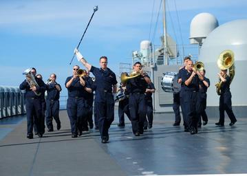 Keywords: USS Blue Ridge 150429-N-OK605-016.jpg en 150429-N-OK605-016 SOUTH CHINA SEA - Drum Major Musician 2nd Class Timothy Deal embarked on the U S 7th Fleet flagship USS Blue Ridge leads the U S 7th Fleet Parade Band during a marching routine on the main deck Blue Ridge is conducting patrols strengthening and fostering relationships within the Indo-Asia Pacific region 2015-04-28 April 29 2015 https //www dvidshub net/image/1904470 150429-N-OK605-016 2015-04-29 09 21 SOUTH CHINA SEA PD-USGov-Military-Navy USS Blue Ridge LCC-19 Images from DoD uploaded by Fæ |