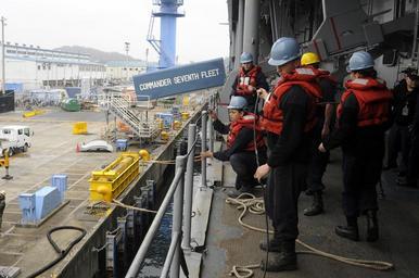 Keywords: USS Blue Ridge action 150309-N-TV402-014.jpg en 150309-N-TV402-014 YOKOSUKA Japan - Sailors attached to the U S 7th Fleet flagship USS Blue Ridge reattach safety lines after the removal of the aft brow Blue Ridge is currently underway conducting unit level training to assess the crew on damage control force protection and seamanship in preparation for upcoming patrols in the 7th Fleet area of operations 2015-03-09 March 9 2015 https //www dvidshub net/image/1808100 150309-N-TV402-014 2015-03-11 00 02 USS BLUE RIDGE JP PD-USGov-Military-Navy USS Blue Ridge LCC-19 Images from DoD uploaded by Fæ |