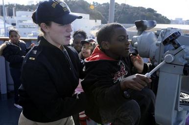 | Keywords: USS Blue Ridge DVIDS239903.jpg en Ensign Jamie Howe lifts a child from The Sullivans Elementary School to look at Yokosuka Naval Base through the big eyes during a tour of U S 7th Fleet flagship USS Blue Ridge Blue Ridge serves under Commander Expeditionary Strike Group 7 and Combined Task Force 76 the Navy's only forward-deployed amphibious force 2010-01-13 Seaman Brian Stone https //www dvidshub net/image/239903 100113-N-+++++-404 2010-01-15 01 08 YOKOSUKA JP PD-USGov-Military-Navy USS Blue Ridge LCC-19 Images from DoD uploaded by Fæ |