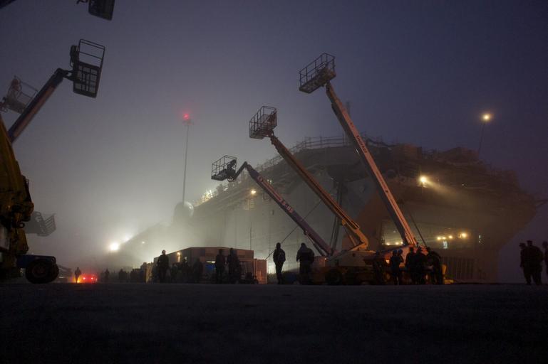 | Keywords: USS Bonhomme Richard Action DVIDS341988.jpg en Sailors assigned to the amphibious assault ship USS Bonhomme Richard LHD 6 walk through early morning fog to the ship and the messing and berthing barge Bonhomme Richard is preparing for a dry-dock maintenance availability period starting in December 2010-11-18 Joe Kane https //www dvidshub net/image/341988 101118-N-+++++-785 2010-11-21 01 51 SAN DIEGO CA US PD-USGov-Military-Navy USS Bonhomme Richard LHD-6 Images from DoD uploaded by Fæ Photographs by Joseph Kane |