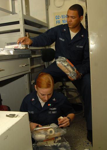 Keywords: USS Bonhomme Richard operations 090604-N-DI345-018.jpg en 090604-N-DI345-021 PACIFIC OCEAN June 4 2009 Hospital Corpsman 3rd Class SW Jenna Wilard and Hospital Corpsman 3rd Class Michael Bonner inventory a first aid box aboard the amphibious assault ship USS Bonhomme Richard LHD 6 while underway conducting training operations Wilard and Bonner are inspecting all 86 first aid boxes on board in preparation for the medical department's annual Medical Readiness Inspection later this month U S Navy photo by Mass Communication Specialist 2nd Class Drew Williams/Released 2009-06-04 Petty Officer 2nd Class Drew Williams https //www dvidshub net/image/1575081 090604-N-DI345-018 2014-09-29 14 59 AT SEA PD-USGov-Military-Navy USS Bonhomme Richard LHD-6 Images from DoD uploaded by Fæ |