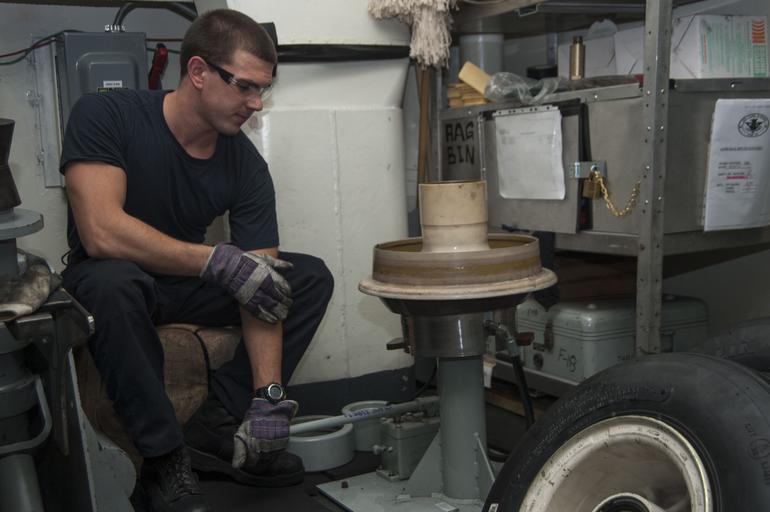 | Keywords: USS Carl Vinson operations 141019-N-UW005-003.jpg en Aviation Structural Mechanic 3rd Class Kevin Bruno from West Milford N J changes the bearing race on an FA-18C/D main landing gear tire in the tire shop aboard the Nimitz-class aircraft carrier USS Carl Vinson The Carl Vinson Carrier Strike Group is currently deployed to the area supporting maritime security operations strike operations in Iraq and Syria as directed and theater security cooperation efforts in the 5th Fleet AOR 2014-10-19 CVN 70 https //www dvidshub net/image/1619765 141019-N-UW005-003 2014-10-19 18 08 USS CARL VINSON AT SEA PD-USGov-Military-Navy USS Carl Vinson CVN-70 Images from DoD uploaded by Fæ |