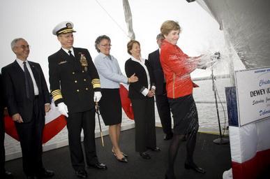 | Keywords: USS Dewey christening.jpg Mrs Deborah Mullen ships sponsor for the precommissioning unit Dewey DDG 105 christens the newest Aegis-class destroyer striking the traditional champagne bottle across the ship's bow at Northrop Grumman Systems Shipyard Pascagoula Miss Jan 26 2008 http //www news navy mil/view_single asp id 54808 Navy NewsStand Photo ID 080126-N-0696M-146<br />http //www news navy mil/ Navy NewsStand Home 2008-01-26 United States Navy Mass Communication Specialist 1st Class Chad J McNeeley PD-USGov-Military-Navy USS Dewey DDG-105 Gordon R England Michael G Mullen in 2008 Ship christenings in the United States Navy Northrop Grumman Shipbuilding Pascagoula Champagne drink |
