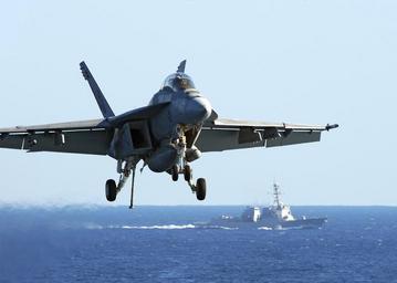 | Keywords: USS Enterprise action DVIDS328424.jpg en An F/A-18F Super Hornet assigned to the Red Rippers of Strike Fighter Squadron 11 prepares to make an arrested landing aboard the aircraft carrier USS Enterprise while the guided-missile destroyer USS Forest Sherman passes the port side during a training exercise The Enterprise Carrier Strike Group is conducting a Composite Training Unit Exercise in preparation for an upcoming deployment 2010-10-07 U S Navy Photo by Petty Officer 3rd Class Brooks B Patton https //www dvidshub net/image/328424 101007-N-+++++-002 2010-10-12 20 23 USS ENTERPRISE AT SEA PD-USGov-Military-Navy F/A-18F Super Hornet in flight Images from DoD uploaded by Fæ |