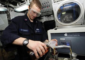 Keywords: USS Essex action 111015-N-WJ771-131.jpg en Petty Officer 2nd Class Kevin J Satorius machinist's mate conducts a bottom sediment and water test on diesel fuel marine in the oil lab aboard the forward-deployed amphibious assault ship USS Essex Essex is part of the Essex Amphibious Ready Group and is conducting operations in the western Pacific 2011-10-15 Petty Officer 2nd Class Casey Kyhl https //www dvidshub net/image/474969 111015-N-WJ771-131 2011-10-18 00 37 PHILIPPINE SEA AT SEA PD-USGov-Military-Navy USS Essex LHD-2 Images from DoD uploaded by Fæ |