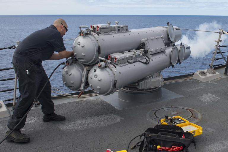 Keywords: USS Farragut transits Atlantic Ocean 150318-N-VC236-156.jpg en 150318-N-VC236-156 ATLANTIC OCEAN - Gunner's Mate 1st Class Kody Kuhlers from Lansing Iowa fires an air slug from a torpedo tube aboard the Arleigh Burke-class guided-missile destroyer USS Farragut Farragut homeported in Mayport Fla is conducting naval operations in the U S 6th Fleet area of operations in support of U S national security interests in Europe 2015-03-18 March 18 2015 https //www dvidshub net/image/1824873 150318-N-VC236-156 2015-03-20 00 01 USS FARRAGUT ATLANTIC OCEAN 3 PD-USGov-Military-Navy USS Farragut DDG-99 Images from DoD uploaded by Fæ |