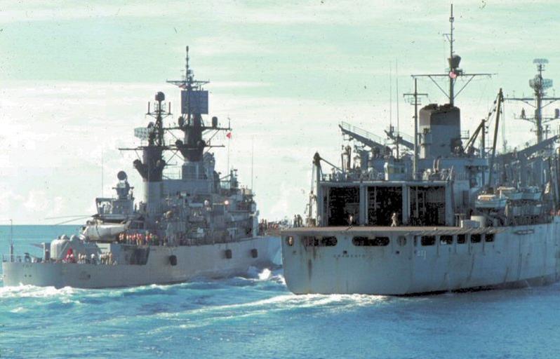 | Keywords: USS Fox (DLG-33) and Sacramento (AOE-1) off Vietnam 1970.jpg The U S Navy guided missle cruiser USS Fox DLG-33 coming alongside the fast combat support ship USS Sacramento AOE-1 in the South China Sea in 1970 Note the Big Mother search and rescue Sikorsky HH-3A Sea King helicopter on Fox´ flight deck Official U S Navy photograph http //www navsource org/archives/09/59/09590157 jpg available on http //www navsource org/archives/04/1133/040133 htm Navsource org 1970 STGC Lee Noland USN aboard USS Bausell DD-845 PD-USGov-Military-Navy USS Fox CG-33 USS Sacramento AOE-1 HH-3A Sea King Vietnam War in 1970 |