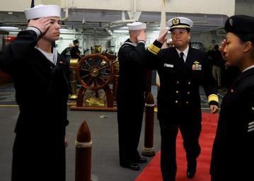 Keywords: USS George Washington 120327-N-ZT599-025.jpg en Sailors render honors to Rear Adm Shinichi Tokumaru chief of Staff of the Japan Maritime Self-Defense Force Fleet Escort Force as he comes aboard the aircraft carrier USS George Washington Tokumaru visited George Washington to meet with Rear Adm J R Haley commander of Battle Force 7th Fleet George Washington returned to her forward-operating port of Commander Fleet Activities Yokosuka after navigating more than 50 000 nautical miles across the western Pacific to operate with more than a dozen different nations during her nine-week patrol George Washington is the Navy's only full-time forward-deployed aircraft carrier ensuring security and stability in the western Pacific Ocean 2012-03-27 U S Navy photo by Mass Communication Specialist Seaman Apprentice Brian H Abel https //www dvidshub net/image/550461 120327-N-ZT599-025 2012-03-29 06 52 USS GEORGE WASHINGTON CVN 73 AT SEA PD-USGov-Military-Navy Fleet Activities Yokosuka USS George Washington CVN-73 Images from DoD uploaded by Fæ Shinichi Tokumaru |