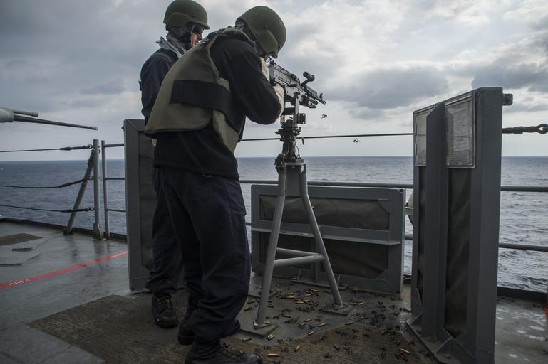 Keywords: USS Germantown crew-served weapons qualification shoot 141024-N-XM324-330.jpg en Gunner ™s Mate 2nd Class Andrew Mattson left from Snowflake Ariz supervises as Operations Specialist Seaman Adrian Lopez from Dallas fires an M240B machine gun during a live-fire exercise aboard the amphibious dock landing ship USS Germantown LSD 42 Germantown is part of the Peleliu Amphibious Ready Group PELARG14 commanded by Capt Heidi Agle and is conducting joint forces exercises in the U S 7th Fleet area of responsibility U S Navy photo by Mass Communication Specialist Seaman Patrick Dionne/Released 2014-10-24 Seaman Apprentice Patrick Dionne https //www dvidshub net/image/1628851 141024-N-XM324-330 2014-10-25 12 21 USS GERMANTOWN AT SEA PD-USGov-Military-Navy USS Germantown LSD-42 M-240 machine gun Images from DoD uploaded by Fæ |