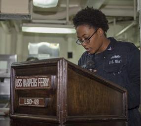MAKE A MEME View Large Image Harpers Ferry operations 160328-N-VS214-096.jpg en 160328-N-VS214-096 PACIFIC OCEAN Yeoman 3rd Class Ebony Shuford talks about female role models during a presentation on Women ™s History Month in the mess decks on board dock landing ship ...