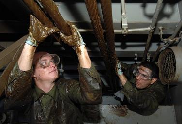 Keywords: USS Harry S. Truman heads to Persian Gulf DVIDS91884.jpg en Machinist's Mate Fireman Michael Morgan and Machinist's Mate 3rd Class George Colon grease wire rope in an elevator shaft aboard the aircraft carrier USS Harry S Truman Truman and embarked Carrier Air Wing 3 are in the Atlantic Ocean preparing for their return to home port after a seven-month deployment in the Persian Gulf 2008-05-27 left https //www dvidshub net/image/91884 080527-N-+++++-005 2008-06-01 18 32 USNORTHCOM AT SEA PD-USGov-Military-Navy USS Harry S Truman CVN-75 Images from DoD uploaded by Fæ |
