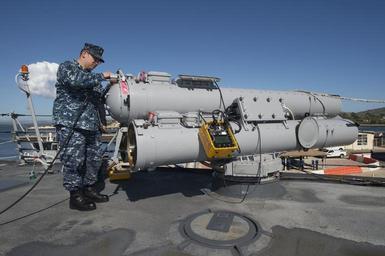 Keywords: USS Jason Dunham operations 150204-N-ZE250-074.jpg en 150204-N-ZE250-074 GUANTANAMO BAY Cuba - Senior Chief Sonar Technician Tom Chavez inspects a surface vessel torpedo tube on the aft missile deck of Arleigh-Burke Class Guided Missile Destroyer USS Jason Dunham while in port in Guantanamo Bay Feb 4 USS Jason Dunham is currently underway in support of Operation Martillo a joint operation with the U S Coast Guard and partner nations within the 4th Fleet area of responsibility 2015-02-04 Feb 4 2015 https //www dvidshub net/image/1755966 150204-N-ZE250-074 2015-02-06 18 02 GUANTANAMO BAY/USS JASON DUNHAM CU PD-USGov-Military-Navy Operation Martillo Guantanamo Bay Images from DoD uploaded by Fæ |