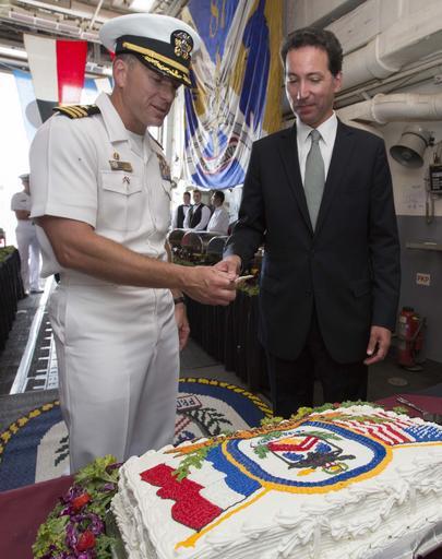 | Keywords: USS Mason action 130805-N-PW661-011.jpg en U S Navy Cmdr Wilson Marks left the commanding officer of the guided missile destroyer USS Mason DDG 87 and Adam H Sterling the Charge d'Affaires at the U S Embassy in Amsterdam prepare to cut a cake during a reception aboard the ship Aug 5 2013 in Amsterdam The Mason was on a port visit to the city while deployed as part of the Harry S Truman Carrier Strike Group in support of maritime security operations and theater security cooperation efforts in the U S 6th Fleet area of responsibility U S Navy photo by Mass Communication Specialist 2nd Class Rob Aylward/Released 2013-08-05 Petty Officer 3rd Class Rob Aylward https //www dvidshub net/image/1019914 130805-N-PW661-011 2013-09-17 05 45 AMSTERDAM NL PD-USGov-Military-Navy USS Mason DDG-87 Images from DoD uploaded by Fæ |