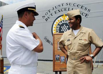 Keywords: USS Nashville returns to port DVIDS180365.jpg en Commander 2nd Fleet Vice Adm Mel Williams Jr speaks with Capt Tushar Tembe commanding officer of the amphibious transport dock ship USS Nashville LPD 13 as the ship returns to Naval Station Norfolk after a five-month deployment in support of Africa Partnership Station APS is a multinational initiative developed by commander U S Naval Forces Europe and commander U S Naval Forces Africa to work with U S and international partners to enhance maritime safety and security in West and Central Africa Nashville deployed in support of maritime security operations and theater security cooperation efforts in the U S 5th and 6th Fleet areas of responsibility 2009-06-12 Petty Officer 3rd Class Tyler Wilson https //www dvidshub net/image/180365 090612-N-+++++-037 2009-06-16 18 06 NORFOLK VA US PD-USGov-Military-Navy Naval Station Norfolk Images from DoD uploaded by Fæ |