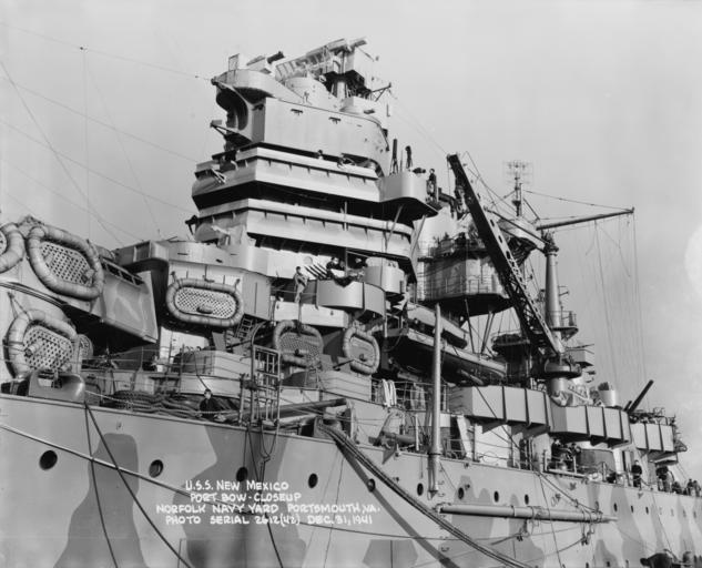 Keywords: USS New Mexico 19-N-27361.jpg en Title USS NEW MEXICO BB-40 Caption Port bow close-up at Norfolk Navy Yard Portsmouth Virginia 31 December 1941 Note details of bridge; turret L ; camouflage and raft stowage; also crane and boat boom; crane; life rafts; Mk 3 radar atop directors Catalog 19-N-27361 1941-12-31 https //www history navy mil/our-collections/photography/numerical-list-of-images/nhhc-series/nh-series/19-N-27000/19-N-27361 html Official US photograph other versions PD-USGov USS New Mexico BB-40 |